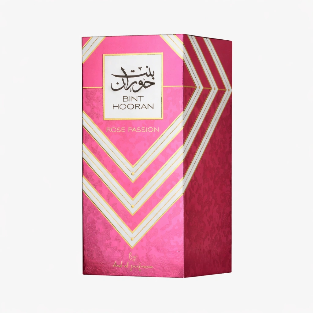 It opens with a burst of lychee, blackcurrant, and apple, creating a crisp and juicy introduction. The heart reveals a luxurious mix of peony, raspberry, and praline, adding a soft floral sweetness with a rich and indulgent twist. As the fragrance settles, the base of cedarwood, amber, and vanilla provides a warm and creamy finish that lingers beautifully. Bint Hooran Rose Passion is a captivating scent that combines freshness, sweetness, and depth in perfect harmony.